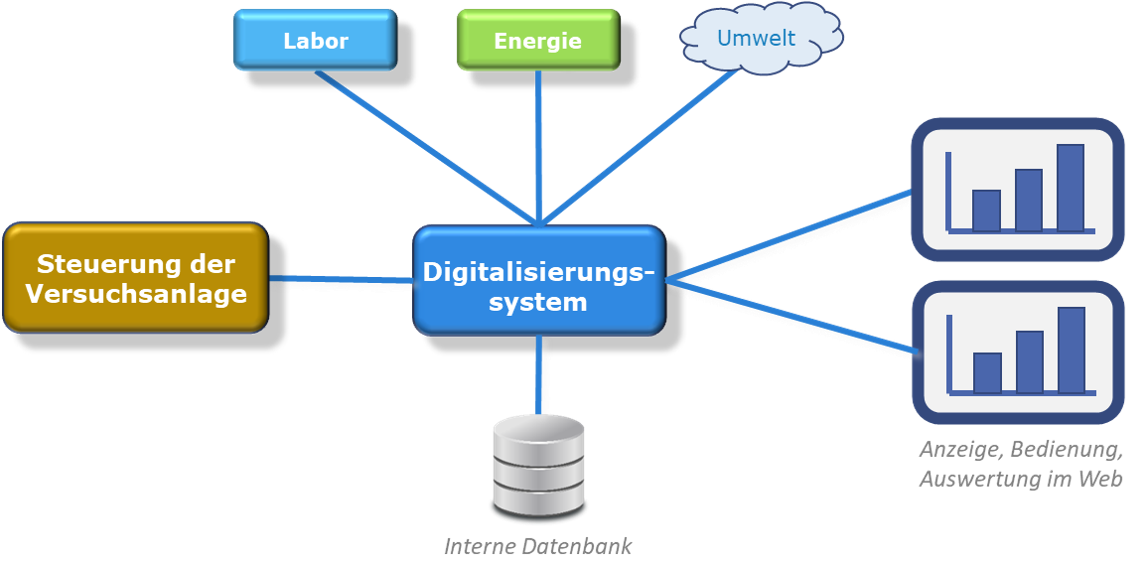 Neben vielen MES-Funktionen wird das Digitalisierungssystem zur automatischen Erfassung der Parameter der Versuchsanlagen genutzt. Über einen OPC-Server werden die Daten aus der Steuerung ausgelesen und hinunter bis auf 100ms zyklisch gespeichert.