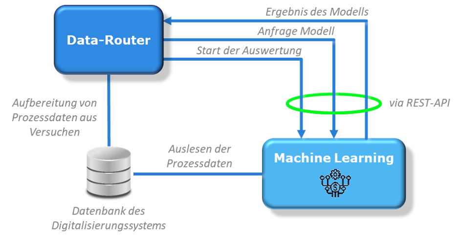 Diese 3 Aufgaben sollen möglichst systemunabhängig gelöst werden. Dazu nutzen wir einen Data-Router, der ohne Visualisierung arbeitet, verschiedene Datenbanken auslesen und überwachen und das ML-Tool ansteuern kann. Für letzteres nutzen wir die REST-API Schnittstelle im Data-Router. Das ML-Tool seinerseits haben wir mit einer solchen Schnittstelle versehen.