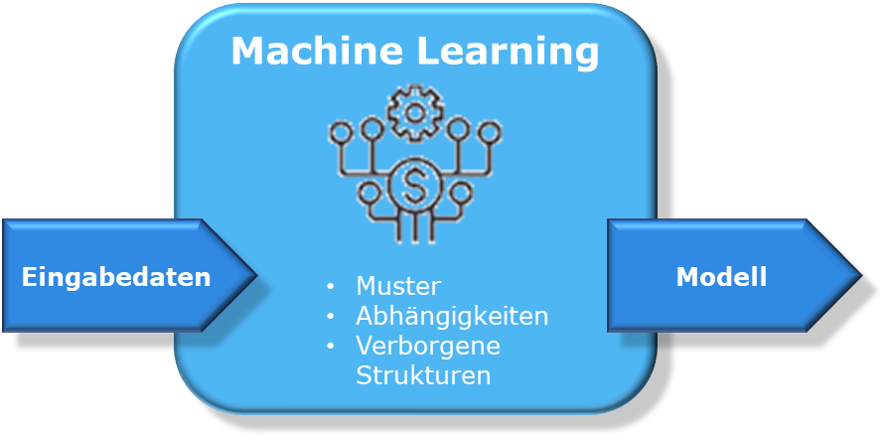 ML erkennt statistische Zusammenhänge in vorliegenden Datenbeständen und ist so in der Lage, eigenständig Lösungen für Probleme zu finden. Ergebnis der ML-Algorithmen ist ein Modell, das für Ergebnisvorhersagen genutzt werden kann. Z.B. können die Ergebnisse für veränderte Eingabedaten simuliert werden.