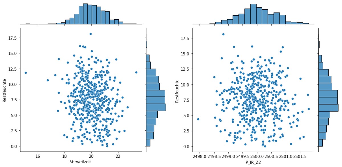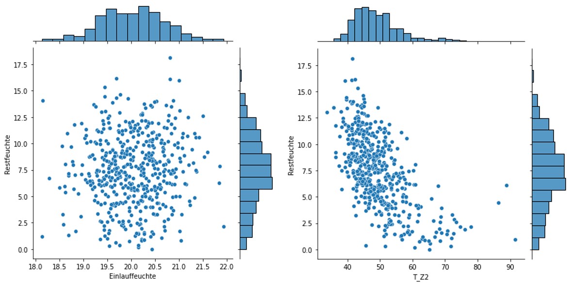 Dabei gilt die Restfeuchte am Ende des Prozesses als Output. Das nächste Diagramm (JointPlot) zeigt die Eingangsfeuchte über der, im Labor gemessenen, Restfeuchte mit einer Häufigkeitsverteilung der Messwerte. Daneben die Abhängigkeit der Restfeuchte von der Temperatur des Materials in einer Zone. Im Digitalisierungssystem können beliebige JointPlots dargestellt werden, mit denen sich Abhängigkeiten einzelner Variablen von anderen identifizieren lassen.