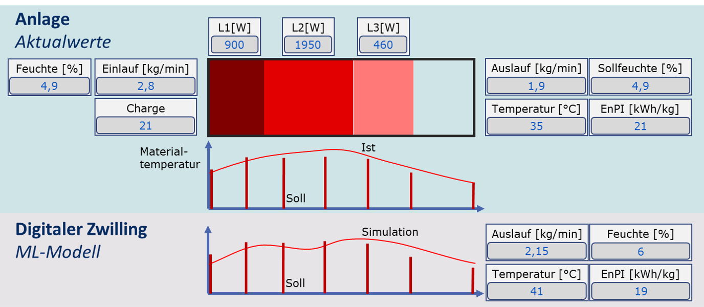 Dazu ruft das Digitalisierungssystem zyklisch die Modellrechnung auf, speichert die Ergebnisse parallel zu den Aktualwerten aus der Anlage und gibt diese in der Visualisierung aus.